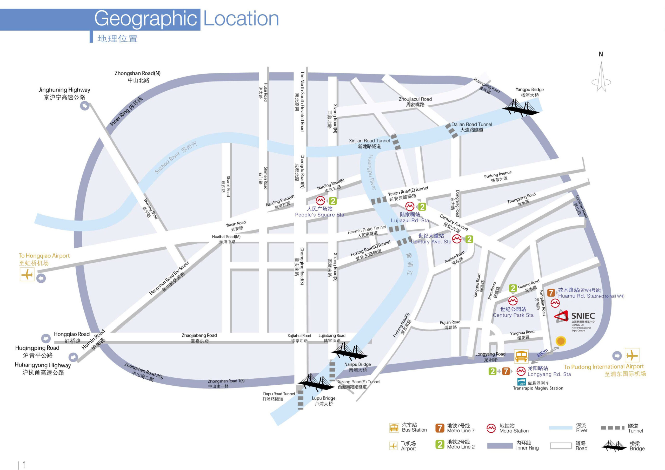 上海新国际博览中心(SNIEC)坐落于上海浦东经济与工业核心发展区。地铁7号线可直达SNIEC,其花木路站紧邻上海新国际博览中心W5号展厅。此外, 大型交通枢纽中心—龙阳路站(位于龙阳路上) 距离SNIEC仅600余米,地铁2 号线、地铁7号线、磁浮列车、以及多条公交线路交汇于此,由龙阳路站步行10分钟,即可抵达SNIEC。